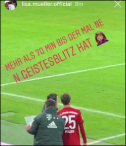 Lisa Müller hatte ein Foto der Einwechslung ihres Mannes beim 1:1 gegen Freiburg in einer Instagram-Story mit den Worten "Mehr als 70 Minuten, bis der mal nen Geistesblitz hat" kommentiert.