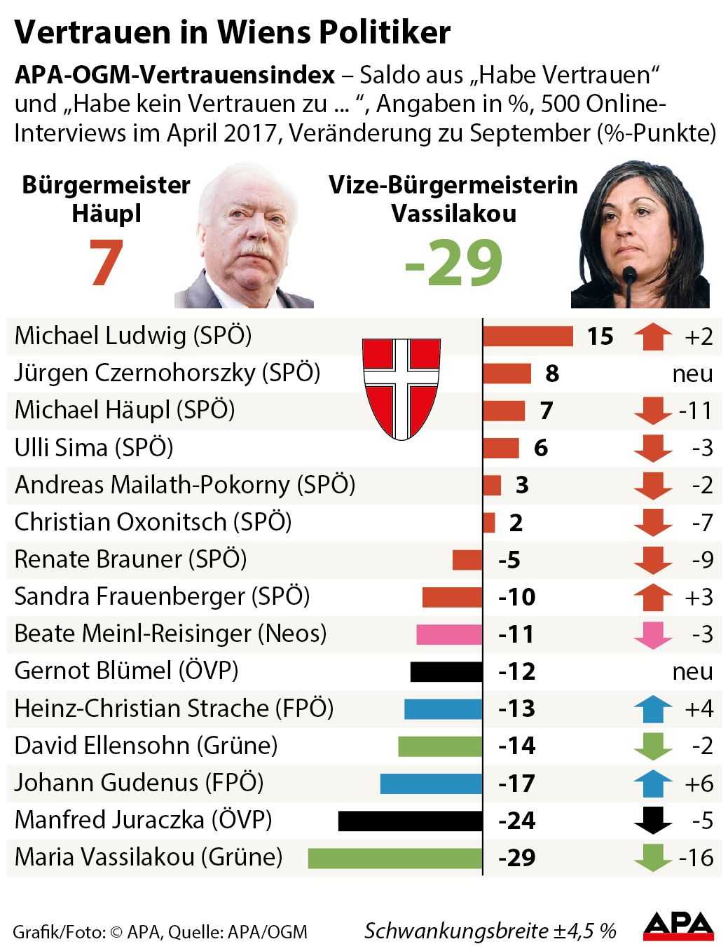 Im aktuellen APA/OGM-Vertrauensindex werden die Werte mit der letzten Erhebung im September 2015 zu Beginn des damaligen Gemeinderats-Wahlkampfs verglichen. Für den Vertrauensindex wurden am 11. und 12. April 500 Wiener ab 16 Jahren online befragt, ob sie den einzelnen Politikern vertrauen oder nicht (maximale Schwankungsbreite: 4,5 Prozent). Der dabei erhobene Wert für die Politiker ergibt sich aus dem Saldo aus habe Vertrauen und habe kein Vertrauen.