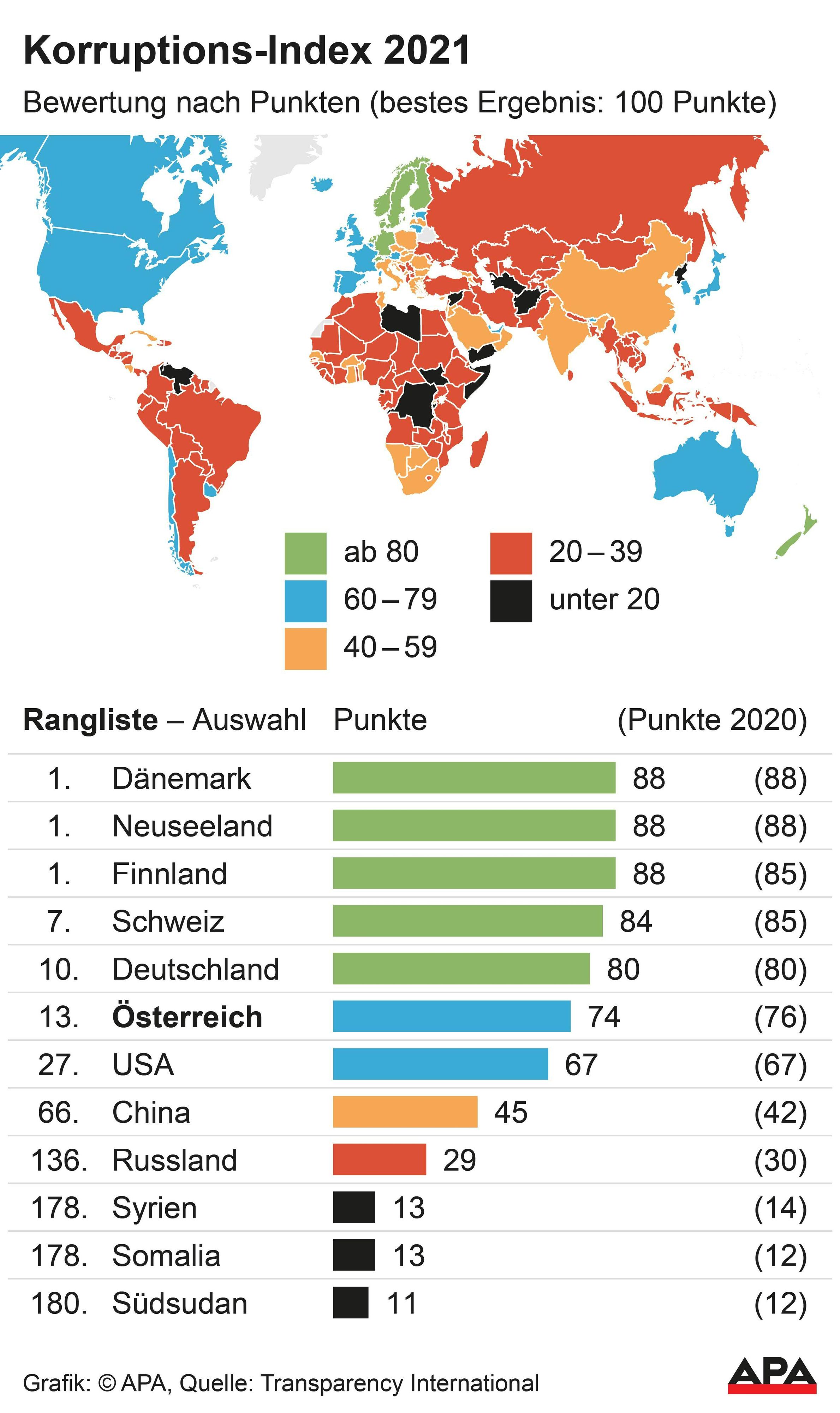 Die Menschen würden allerdings zu Recht erwarten, „dass die Politik endlich konkrete Schritte setzt“. Im internationalen Ranking für saubere Politik hatte Österreich zuletzt an Plätzen eingebüßt. Mitte Jänner befand sich Österreich nur noch auf Rang 13 der transparentesten Länder – das zeigt der internationale Korruptionsindex 2021 von Transparency International (TI).