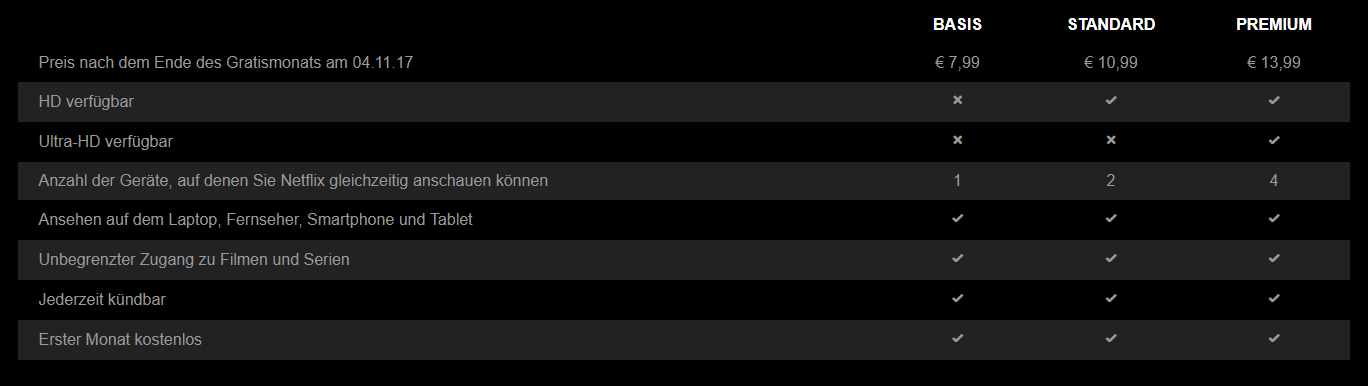 Konkret geht es um zwei Produktpakete: Die Standard-Ausführung (2 Geräte, kein Ultra-HD) kostet künftig 10,99 Euro statt 9,99 Euro, während der Abo-Preis des Premium-Pakets (4 Geräte, Ultra-HD) von 11,99 Euro auf 13,99 Euro angehoben wird. Lediglich die Basis-Ausführung (ein Gerät, kein HD) bleibt beim ursprünglichen Preis von 7,99 Euro.