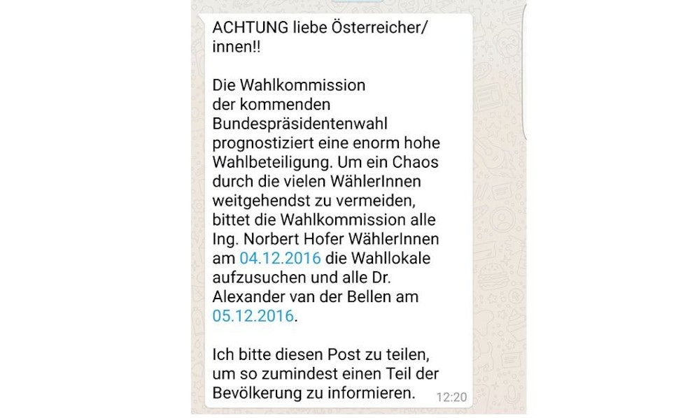 Wie der "Standard" berichtet, kursieren SMS, in denen steht, dass die Wahllokale aufgrund des hohen Andrangs überfüllt seien. Deshalb sollen heute nur Hofer-Wähler hingehen, die Van der Bellen-Anhänger erst morgen.