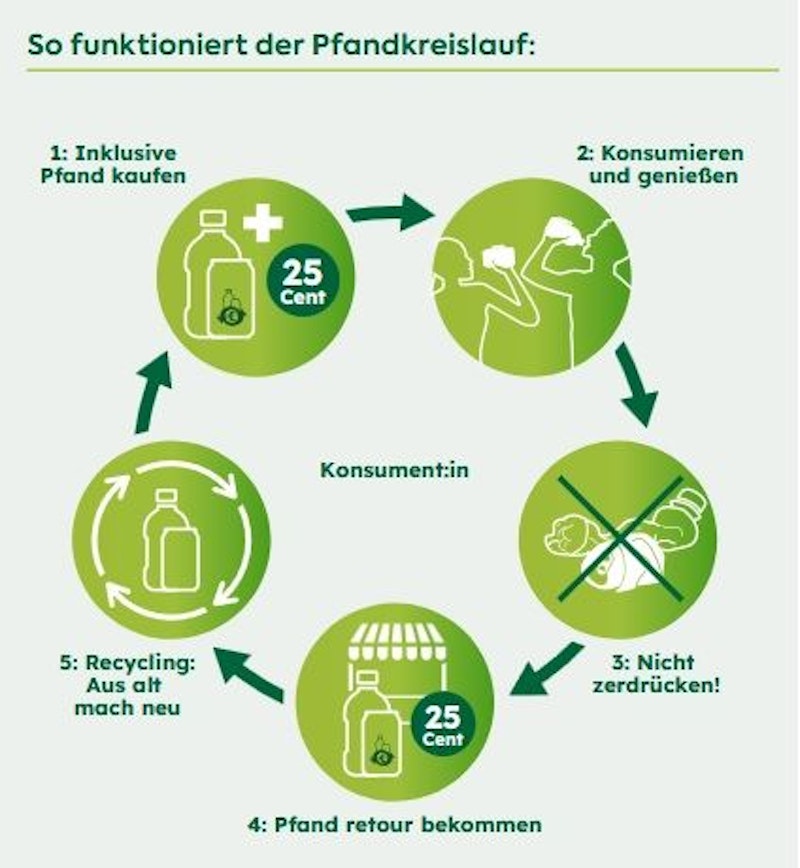 Am 1. Jänner 2025 ist in Österreich die neue Einwegpfandverordnung in Kraft getreten. Seither zahlen Kunden beim Kauf von PET-Flaschen und Aludosen mit dem österreichischen Einwegpfandlogo 25 Cent Pfand und erhalten es bei der Rückgabe wieder retour.