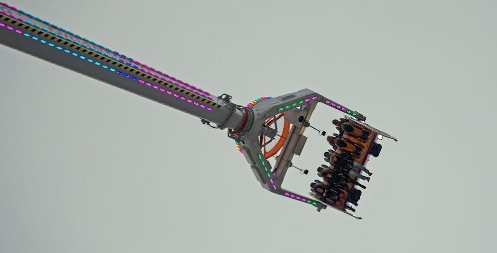 Horror am Rummelplatz: Kurz vor 23 Uhr ging am Hamburger Rummelplatz "Dom" das Licht aus. Neun Fahrgäste hingen am Samstag 68 Meter über dem Erdboden in ihrer Gondel im "Flasher" kopfüber fest. Laut Webseite gilt der 60 Tonnen schwere "Flasher", der die Fahrgäste mit bis zu 120 km/h durch die Luft wirbelt, als höchstes Loopingflug-Fahrgeschäft der Welt.