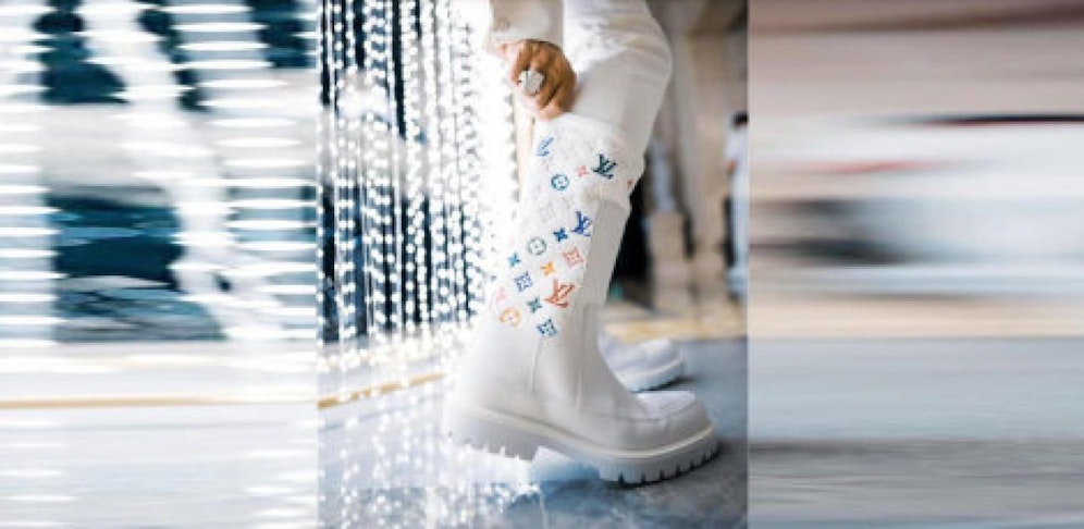 Wobei: Kleine Farbtupfer hatte sein Outfit. Auf seinen weißen Stiefeln waren die zahlreichen kleinen Louis-Vuitton-Logos farbig ausgemalt.
