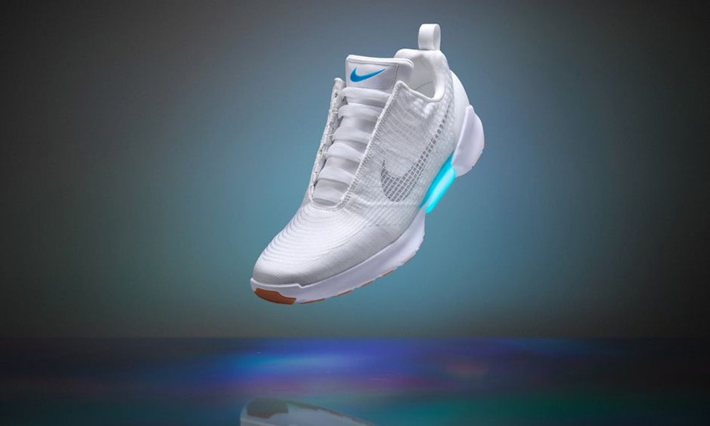 Den HyperAdapt 1.0 gibt’s zum Start nur in den USA. So funktioniert er: Berührt die Ferse einen Sensor an der Innensohle, ziehen Motoren die Bänder fest. Die Stärke lässt sich per Einstellknopf anpassen. Der drahtlos ladbare Akku soll zwei Wochen halten.