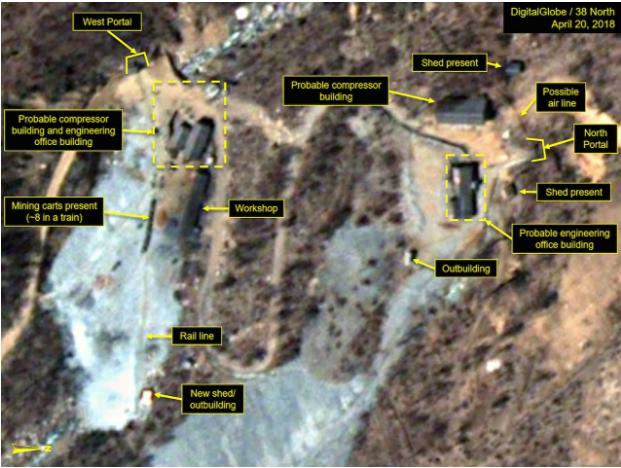 "Zwischen dem 20. April und dem 7. Mai 2018 wurden das wahrscheinliche Ingenieursgebäude und eine mögliche Instrumentenbaracke knapp außerhalb des Nordportals (wo mindestens fünf unterirdische atomare Tests durchgeführt wurden) dem Erdboden gleich gemacht, zusammen mit mindestens zwei weiteren kleineren Gebäuden oder Baracken", berichtet das auf Nordkorea spezialisierte Portal und veröffentlichte entsprechende Satellitenbilder.