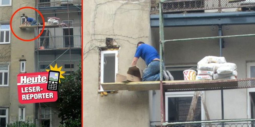 Ein Arbeiter kniet auf einer Holzplanke, die als Verlängerung für das nicht ganz passende Gerüst gedacht ist. Zwar wurde die wackelige Konstruktion mit ein paar schweren Säcken "gesichert", ganz ungefährlich scheinen die Arbeitsbedingungen aber nicht zu sein.