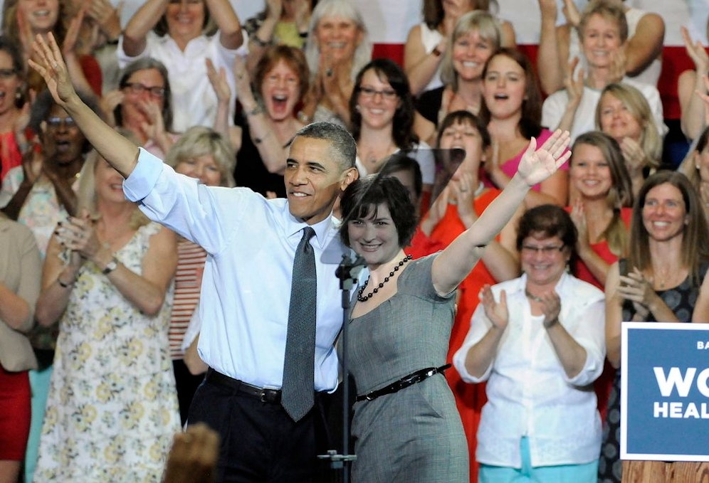"Was die Rechte der Frauen betrifft, in Sachen Gesundheit ihre eigenen Entscheidungen zu treffen, wollen sie (die Republikaner) uns zurückführen zu einer Politik, die mehr in die 1950er Jahre passt als ins 21. Jahrhundert", sagte Obama vor einer jubelnden Menge. Und direkt an die Frauen gerichtet fügte er hinzu: "Die Entscheidungen, die die Gesundheit der Frauen betreffen, sollten nicht von Politikern getroffen werden und nicht von Versicherungskonzernen, sondern von Euch."