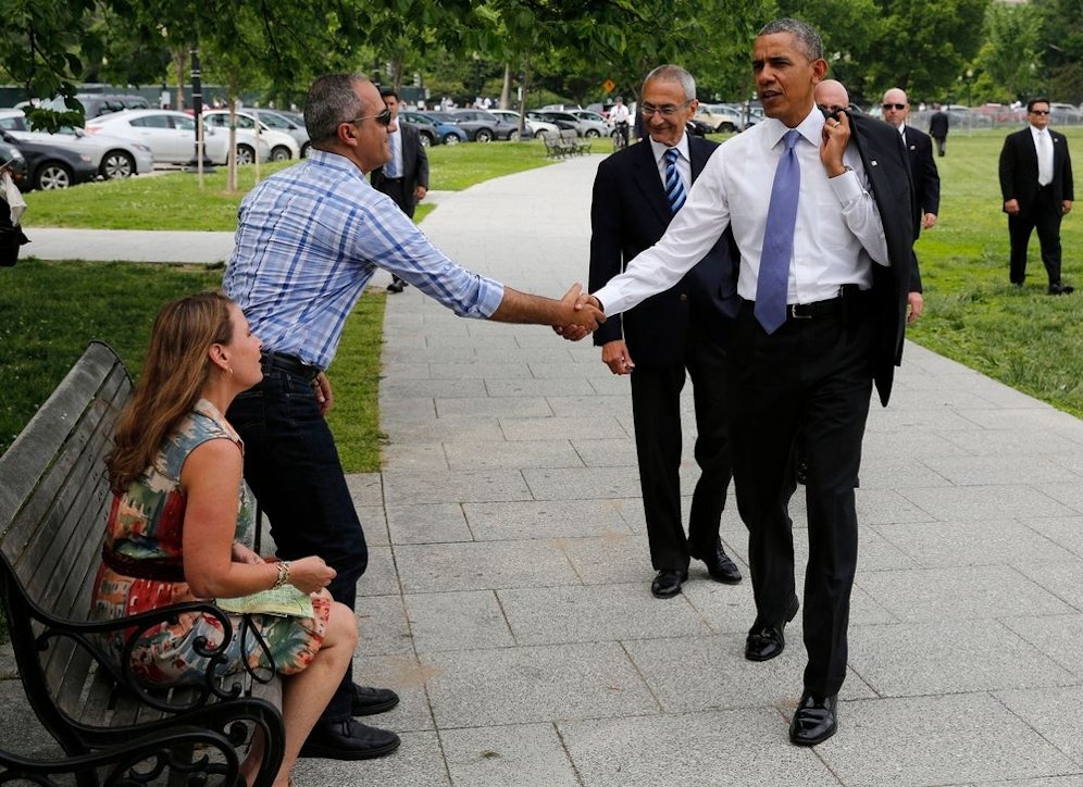 Er wollte sich die Beine vertreten und ging zu Fuß vom Weißem Haus ins Innenministerium. So ganz entspannt war's dann aber doch nicht: Während Obama mit Touristen plauderte, hatten seine Bodyguards jede Menge Stress.