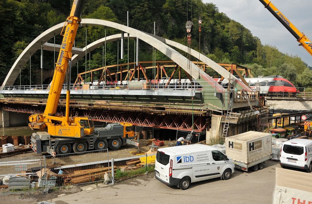 Am Samstag beginnt die Hauptbauphase im Zuge der Erneuerung der Kugelsteinbrücke zwischen den Bahnhöfen Peggau/Deutschfeistritz und Frohnleiten. Die aus 1966 stammende alte Stahlfachwerkbrücke wird ausgebaut und das daneben errichtete, rund 3.000t schwere neue Tragwerk mit hydraulischen Pressen eingeschoben. Pünktlich zum steirischen Schulbeginn soll der Bahnverkehr wieder aufgenommen werden.