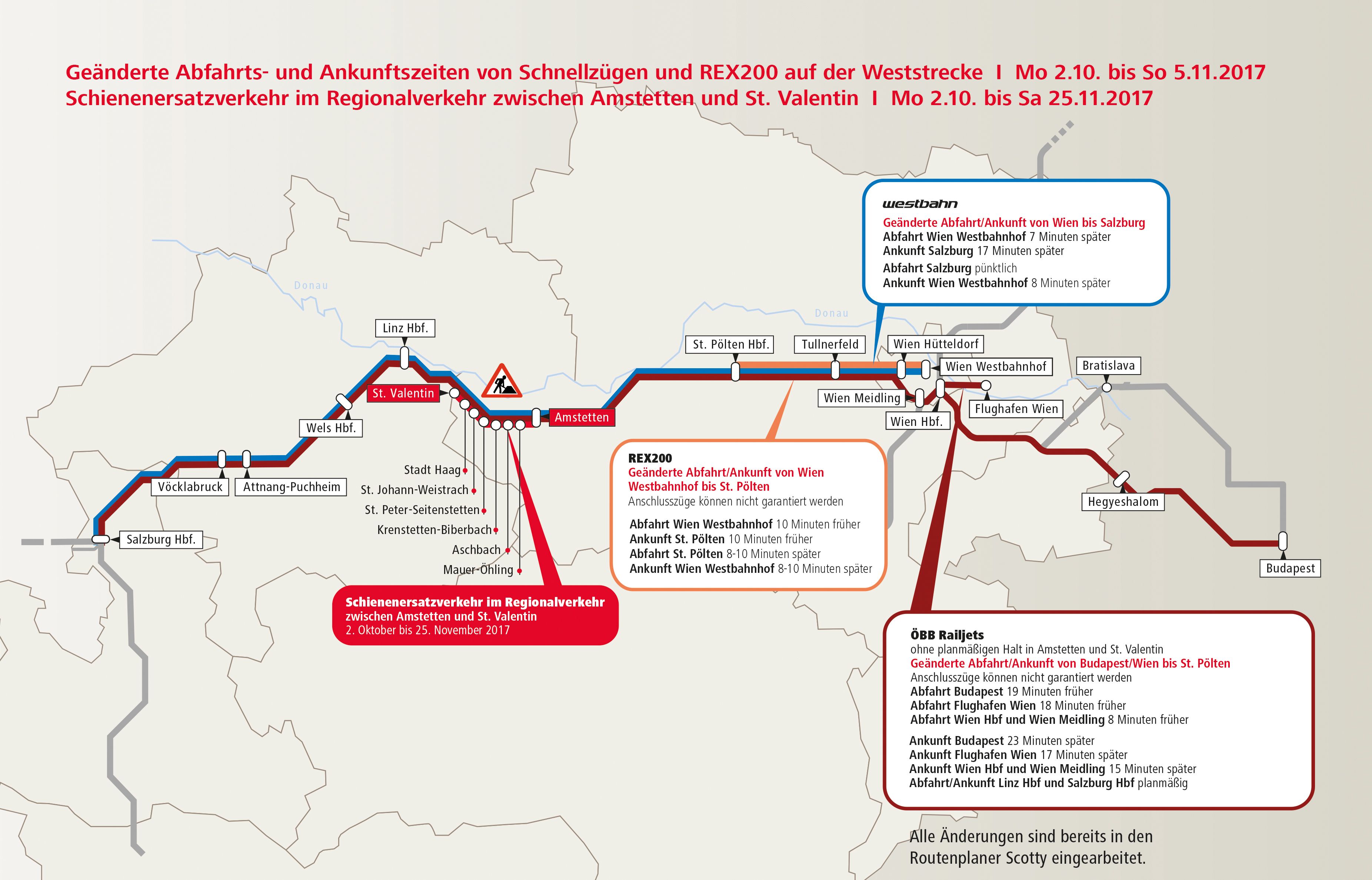 Die Hochleistungsstrecke von St. Pölten nach Linz muss modernisiert werden, daher muss die Westbahnstrecke zwischen Amstetten und St. Valentin von 2. Oktober bis 25. November teilweise gesperrt werden.