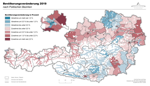 Die beiden Bundesländer Salzburg (+0,57%) und Oberösterreich (+0,55%) verzeichneten ein überdurchschnittliches Wachstum. Niederösterreich lag mit +0,40% beim Bundesländervergleich genau im Mittelfeld, während sich in Tirol (+0,39%), im Burgenland (+0,34%) und in der Steiermark (+0,27%) etwas geringere Zuwächse ergaben. In Kärnten erhöhte sich die Bevölkerungszahl 2019 hingegen nur um +0,06%.