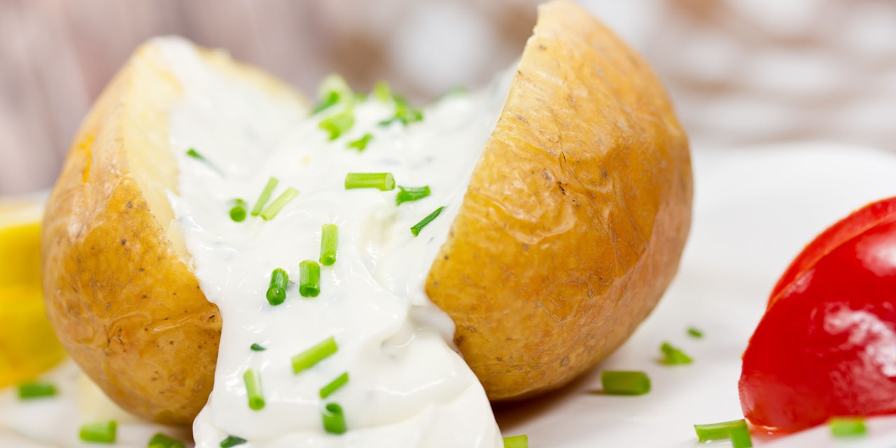 3. Wenn die Ofenkartoffel gar sind, Folie öffnen, mit einem Messer der Länge nach einschneiden und mit der Schnittlauchsauce bedecken.