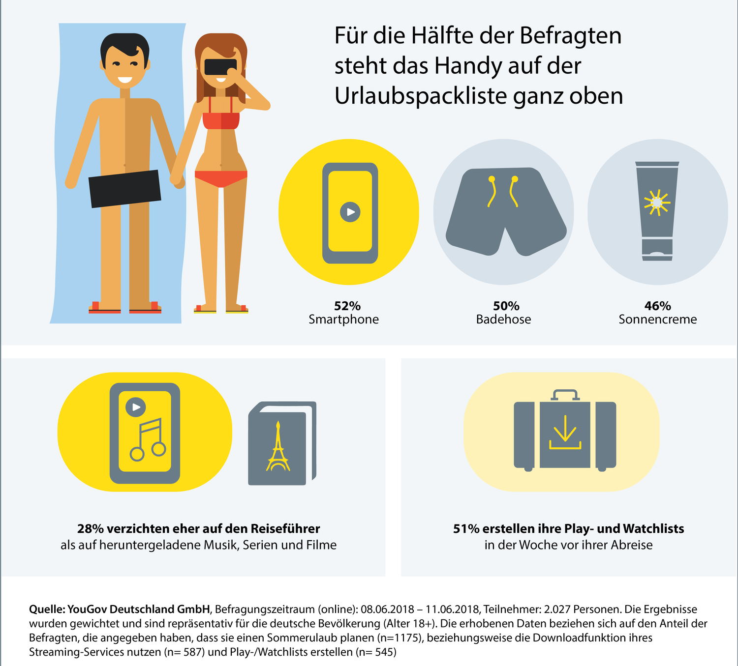 Lieber nackt und mit Sonnenbrand als ohne Smartphone: Bei mehr als der Hälfte der Interviewten (52 Prozent), die einen Sommerurlaub planen, steht das Handy ganz oben auf der Packliste – noch vor Badehose, Sonnencreme und Co. 28 Prozent der Befragten, die die Downloadfunktion ihres Musik- oder Video-Streamingservices nutzen, geben an, dass sie eher den Reiseführer daheimlassen, als auf heruntergeladene Musik, Serien und Filme zu verzichten.