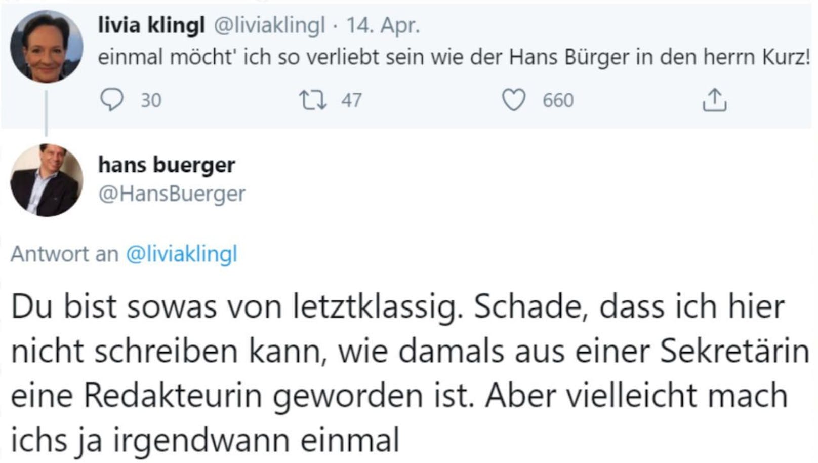 "Einmal möcht' ich so verliebt sein wie der Hans Bürger in den Herrn Kurz!", postete Livia Klingl am 14. April auf ihrem Twitter-Profil.