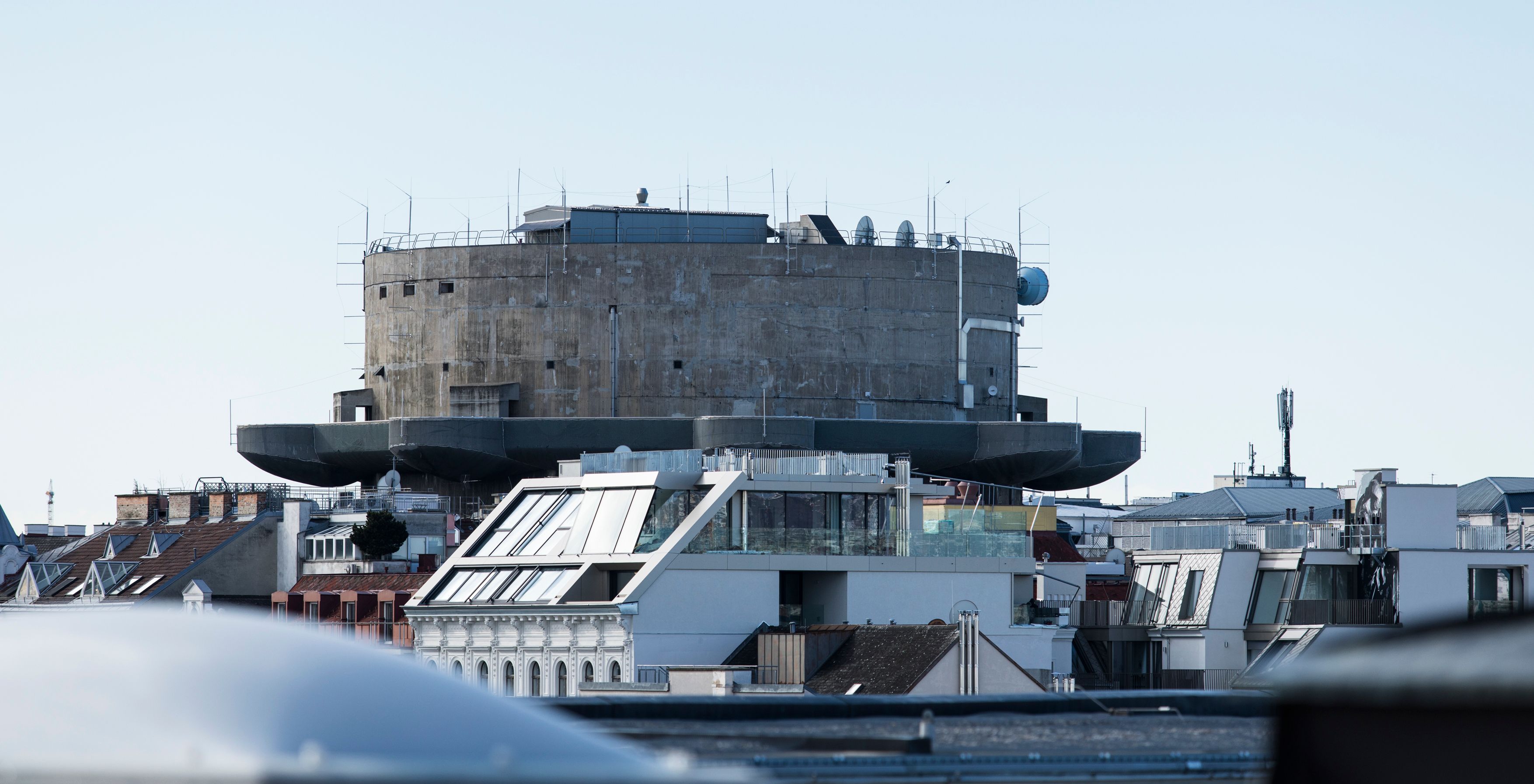 Der Flakturm in der Stiftkaserne über den Dächern von Wien-Neubau