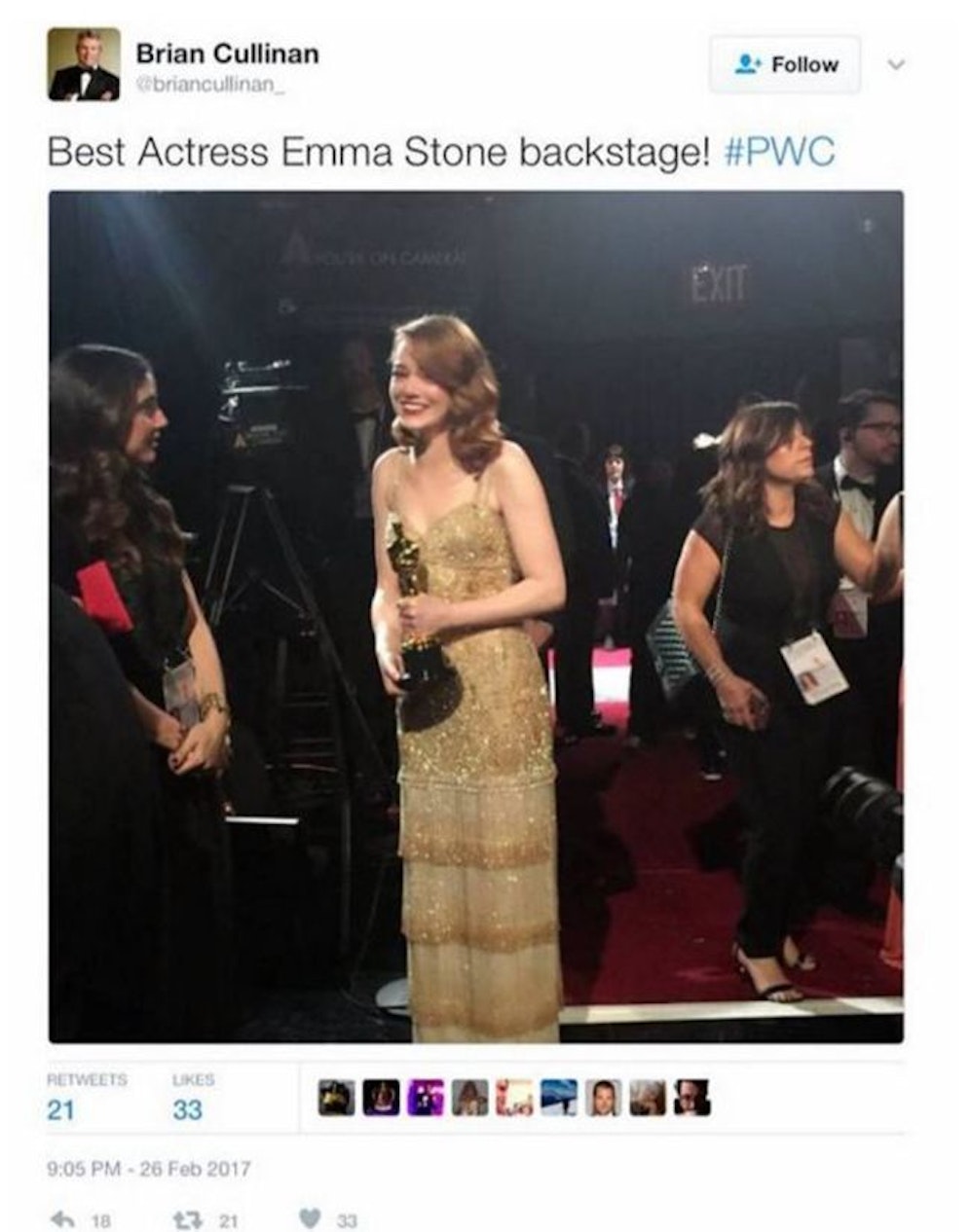 Das Foto von Emma Stone wurde mittelerweile von Cullinans Twitter-Account gelöscht. PricewaterhouseCooper haben für den Vorfall die volle Verantwortung übernommen. "Unser Partner auf der linken Bühnenseite, Brian Cullinan, hat den falschen Umschlag an Warren Beatty weitergegeben", sagte der Vorsitzende Tim Ryan in einer Erklärung.