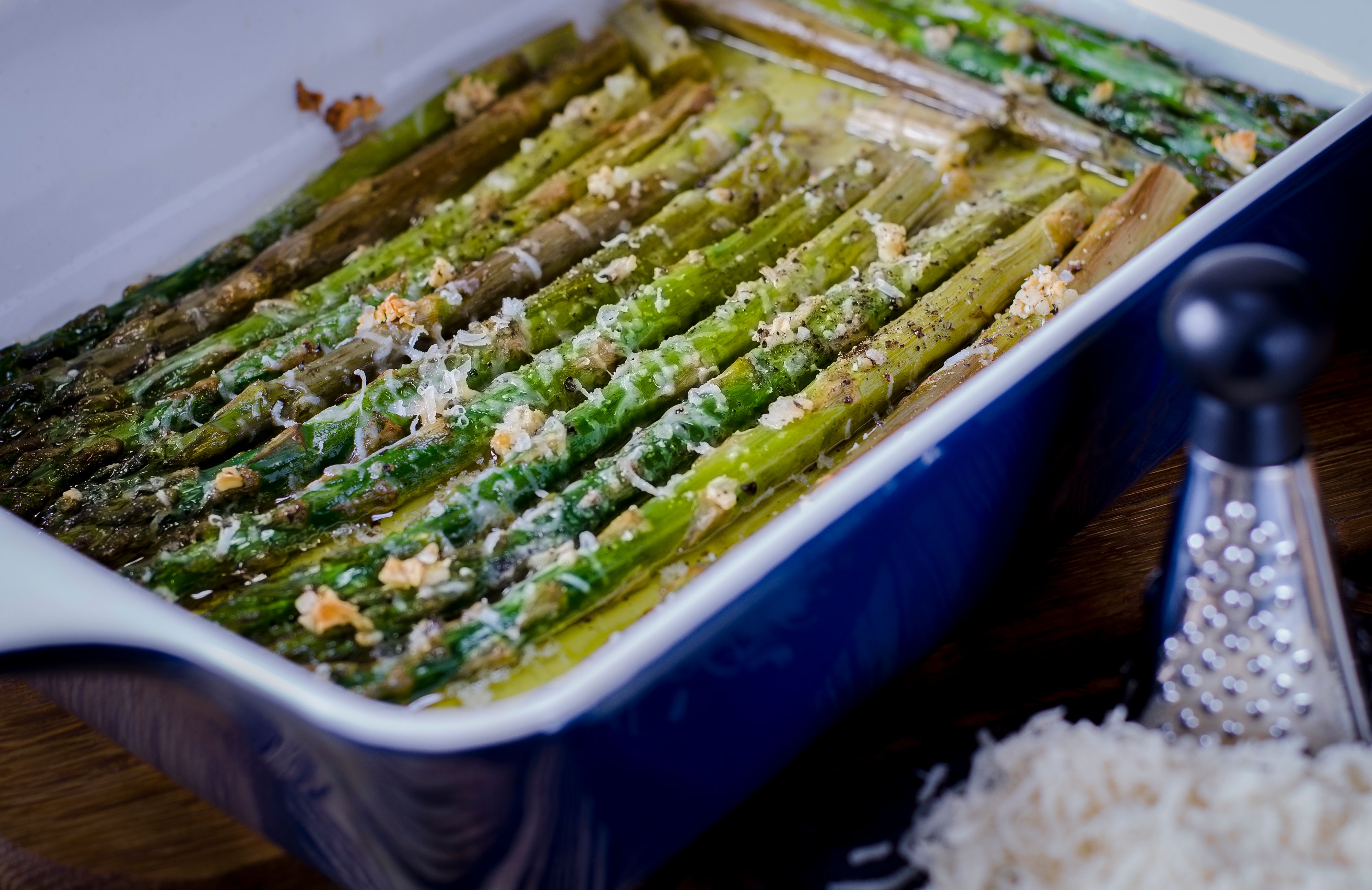 Spargel in eine feuerfeste Form oder auf eine feuerfeste Platte legen und mit Salz und Pfeffer würzen.