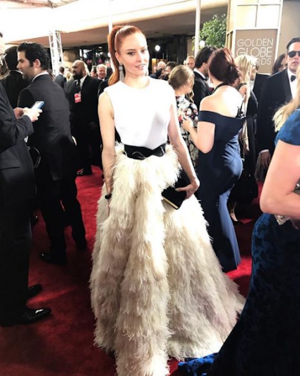 Mit Accessoires von Balmain, Jimmy Choo und Sergio Rossi wurde der aufwändig genähte Federnrock von Stylist Simon Winkelmüller kombiniert. Stolz postete Meier ein Foto vom Red Carpet, nach dem anstrengenden Abend auch eines aus dem Hotelzimmer.