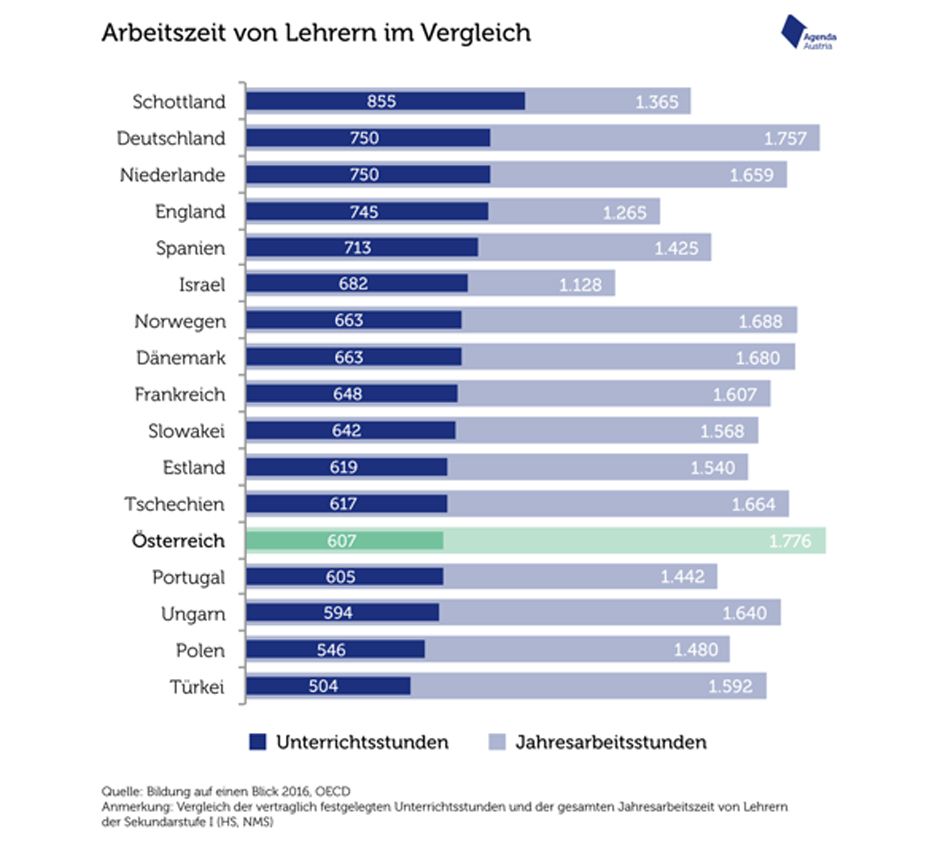 1.776 Stunden beträgt die jährliche Gesamtarbeitszeit österreichischer Lehrer. Sie liegt damit weit über jener der 16 übrigen Länder, die bei der Studie der "Agenda Austria" verglichen wurden (Schottland, Deutschland, Niederlande, England, Spanien, Israel, Norwegen, Dänemark, Frankreich, Slowakei, Estland, Tschechien, Portugal, Ungarn, Polen, Türkei).
