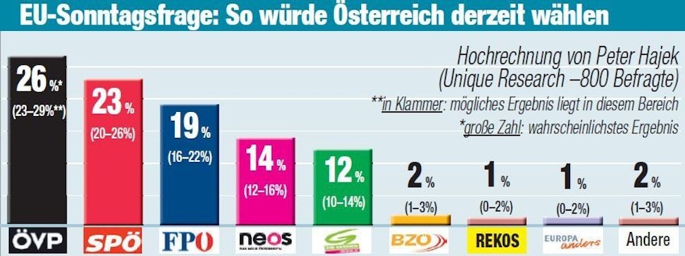 Ein Minus von 4 % gegenüber 2009 könnte VP-Spitzenkandidat Karas verschmerzen: Mit 26% (Schwankungsbreite: ±3 %) würde er Platz 1 halten.