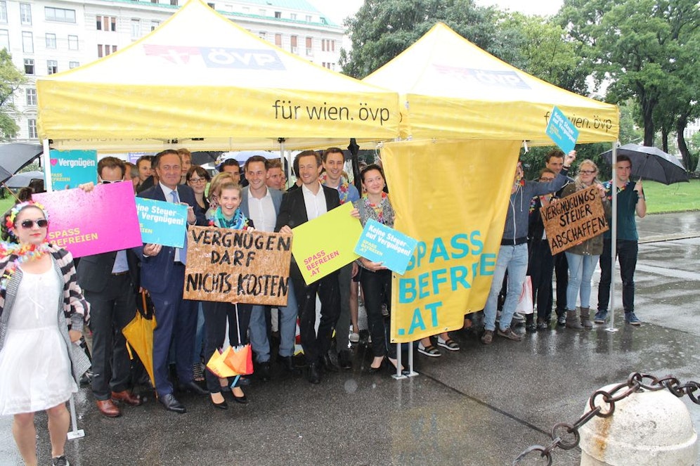 Wiener ÖVP, Wirtschaftsbund Wien und Junge ÖVP Wien brachten einen Antrag zur Abschaffung der Vergnügungssteuer im Wiener Gemeinderat ein und initiierten einen Flashmob zum „Spaß befreien“. Der ging aufgrund des heftigen Regens Montagvormittag aber etwas baden... Die NEOS brachten ebenfalls einen entsprechenden Antrag ein.