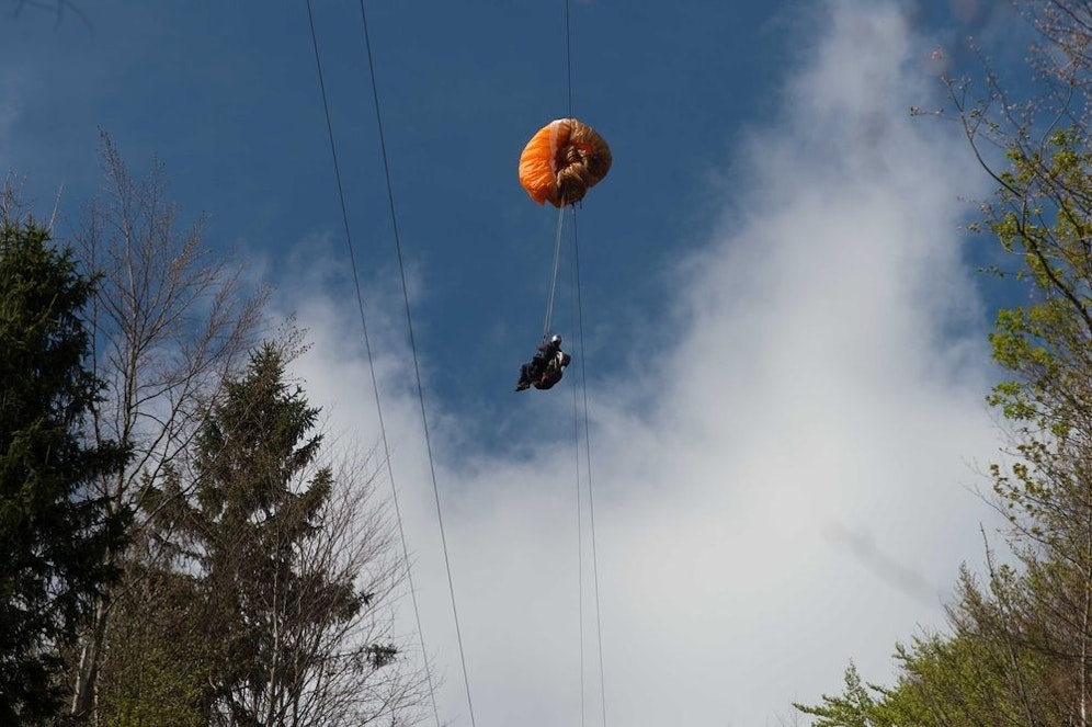 Ein Paragleiter flog am Montagnachmittag in Molln im oberösterreichischen Bezirk Kirchdorf gegen eine Materialseilbahn und verfing sich. Der Sportler musste stundenlang in einer Höhe von 50 Metern ausharren, ehe er geborgen wurde.