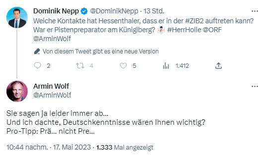 Dem FPÖ-Politiker passierte in seinem Tweet zudem ein peinlicher Fehler. Just ein Vertreter jener Partei, die eine Deutschpflicht an Österreichs Schulhöfen fordert und mangelnde Sprachkenntnisse bei Kindern und Migranten beklagt, stolpert über die Rechtschreibung. "Und ich dachte, Deutschkenntnisse wären Ihnen wichtig? Pro-Tipp: Prä… nicht Pre…" weist ihn Armin Wolf deswegen zurecht.