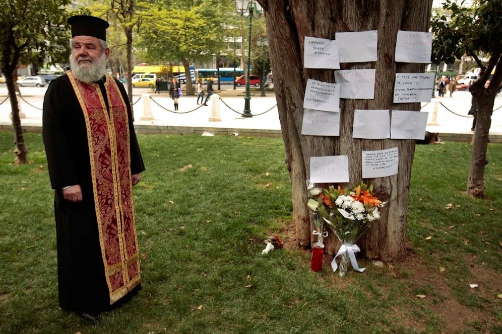 Später am Tag hielt ein orthodoxer Priester eine Zeremonie am Ort des Selbstmords ab. Einige Athener hinterließen Blumen und Kerzen.