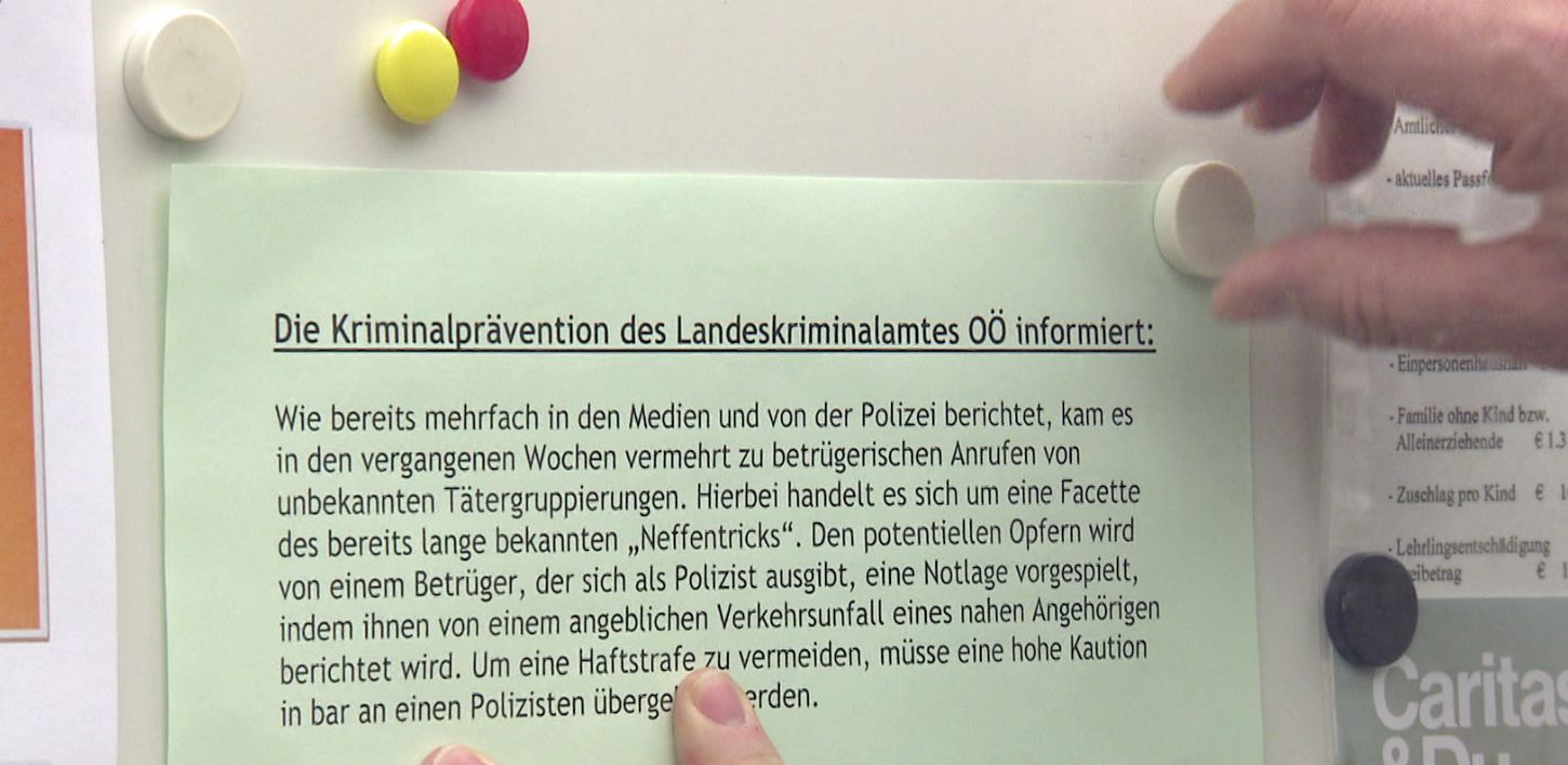 Und: Die Polizei hat zudem auch die Bürgermeister des Landes mit Infomaterial versorgt, damit auf den Gemeindeämtern die Warnhinweise ausgehängt werden. Um auch dort vor den Betrügern zu warnen.