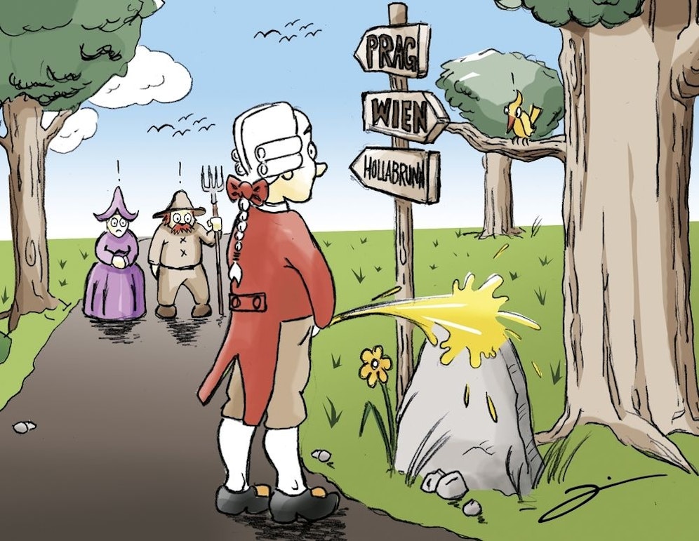 Von Wien nach Prag – zu Mozarts Zeiten in der Kutsche eine kleine Ewigkeit. In Raschala, einem Dorf bei Hollabrunn, verspürte der Meister ein dringendes Bedürfnis. Man hielt an, ein fester Strahl ergoss sich über einen Stein. So berichtet die Legende. Der Vorfall und der Fels gingen in die Geschichte ein.