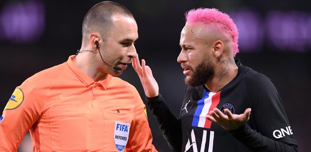 Kuriose Szene, kuriose Strafe und eine heftige Diskussion! Neymar liefert mit neuer Haarfarbe eine sehenswerte Einlage und sieht dafür Gelb. Die Folge: Ein Schlagabtausch mit dem Unparteiischen.