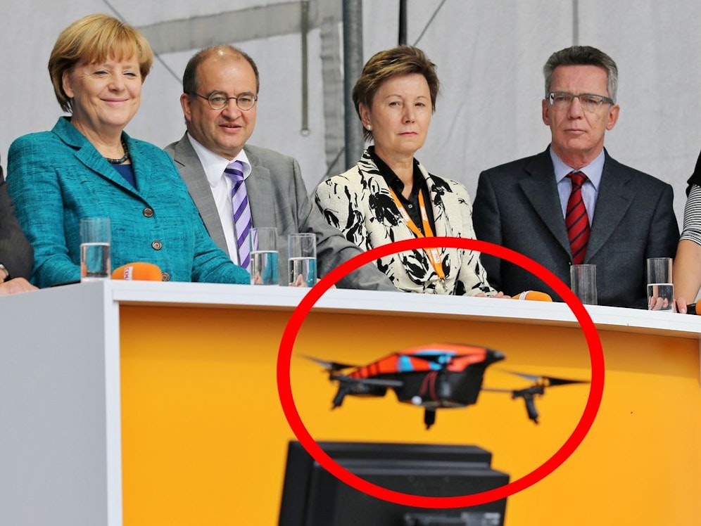 Bei einer Kundgebung zur deutschen Bundestagswahl in Dresden ist eine kleine Kamera-Drohne direkt vor Kanzlerin Angela Merkel und dem deutschen Verteidigungsminister Thomas de Maiziere abgestürzt. Verantwortlich für den spielerischen Beobachtungsflug am Sonntag war die deutsche Piratenpartei.