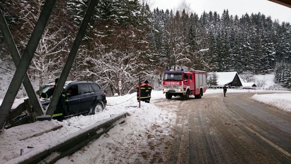 Der Autofahrer verlor in einer Linkskurve unter der Fahrradbrücke die Kontrolle über sein Fahrzeug, der Pkw schlitterte über die Fahrbahn, durchbrach einen Holzzaun und blieb im Straßengraben in einer Schneewächte stecken.