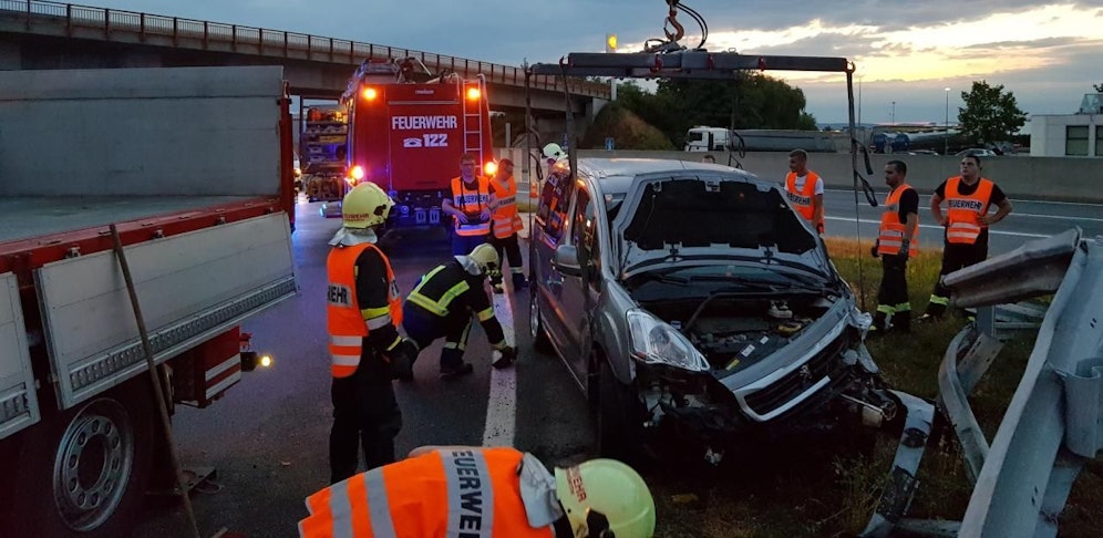 Die Feuerwehr musste aufgrund der immensen Verkeilung erst die Leitschiene entfernen, bevor das demolierte Wrack mit Hilfe des Krans verladen und von der Autobahn gebracht werden konnte.