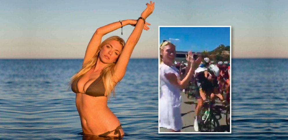 Playboy-Model April Summers rückt sich beim Giro d'Italia vor dem heranbrausenden Peloton ins Licht – und wird dann fast von den Profis überrollt.