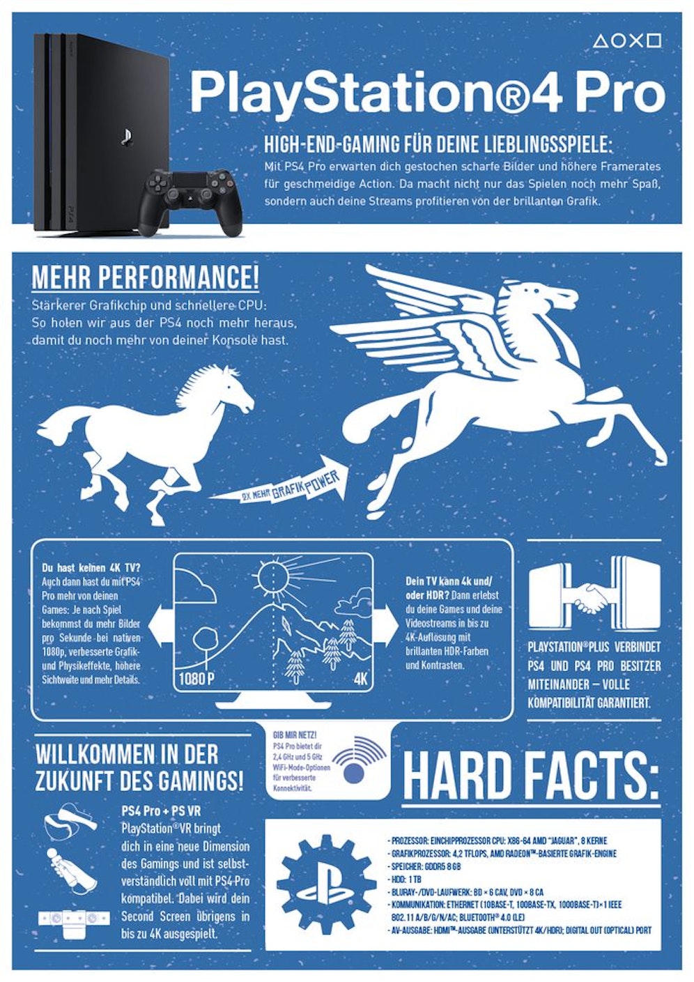 Was kann die PlayStation 4 Pro, was die PlayStation 4 nicht kann? Und welche technischen Unterschiede gibt es? Sony PlayStation gibt die Antworten auf diese Fragen in einer umfassenden Info-Grafik.