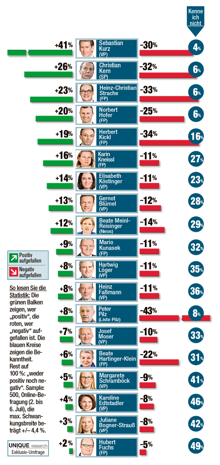 VP-Chef Sebastian Kurz kam im Juni auf 23 % Negativ-Nennungen. Jetzt liegt er bereits bei -30 %. Die Positiv-Nennungen dagegen blieben nahezu unverändert (41 % nach 42 % im Juni).