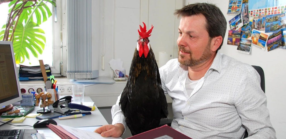 Maxl ist blind und auf Hilfe angewiesen. Deswegen verbringt der Hahn seinen Alltag manchmal im Büro seines Besitzers – nicht ganz ohne Störgeräusche.