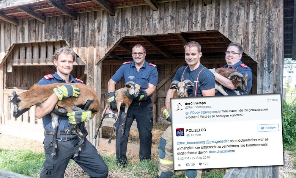 Nachdem die Tiere eingefangen waren, twitterte die Polizei eine Meldung dazu und bekam prompt eine Anfrage: "Was haben die Ziegenaussagen ergeben? Wird es zu Anziegen kommen?" wollte User "derchristoph" wissen.