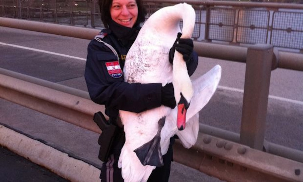 Ein verletzter Schwan ist am Montag auf der Brigittenauer Brücke von einer Polizistin eingefangen worden. Das Tier, das gegen die Brücke geflogen war, befindet sich laut Tierärzten auf dem Weg der Besserung.