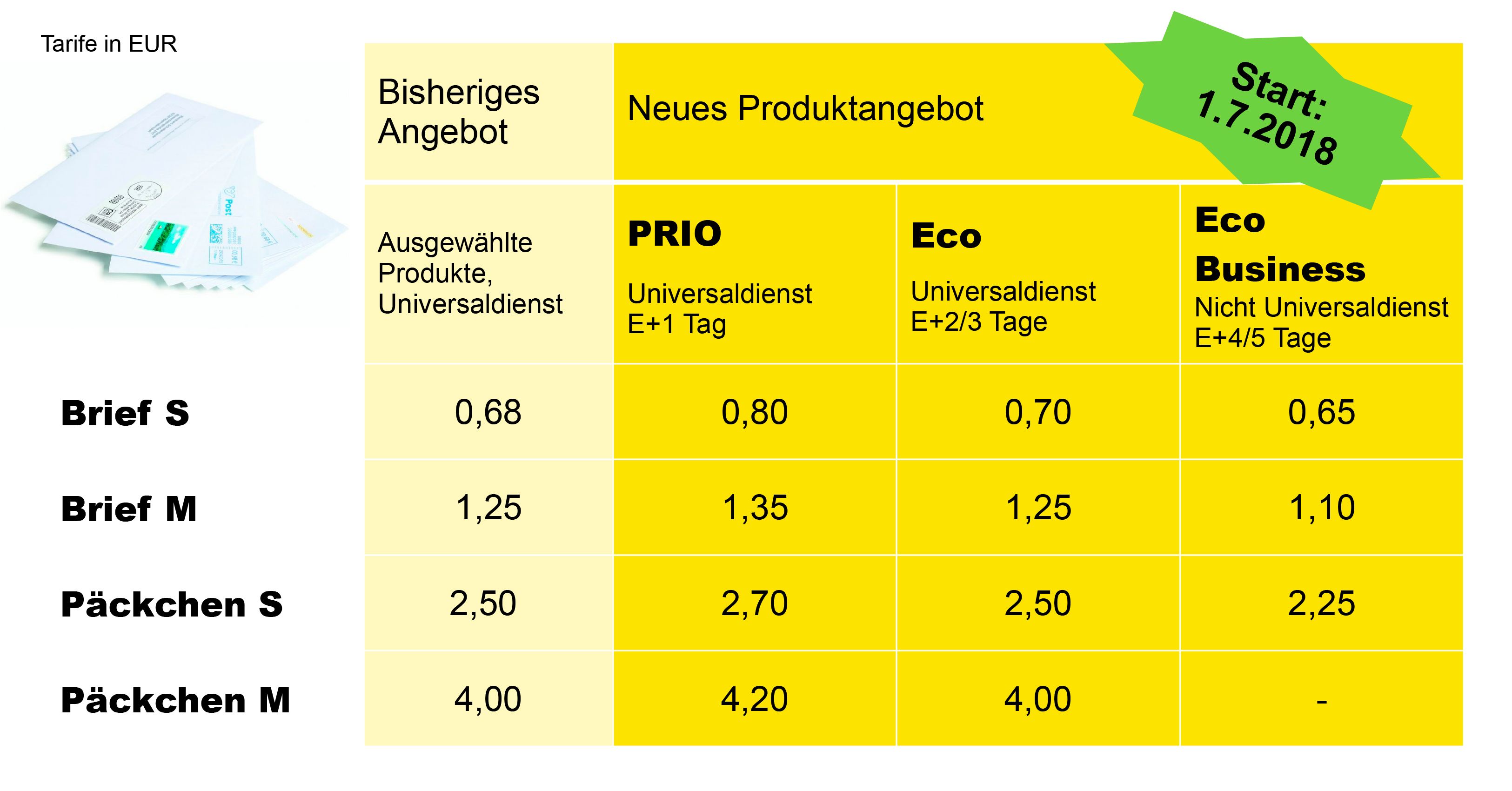 Pakete für Eilige verteuern sich von 2,50 Euro auf 2,70 Euro (Päckchen S) bzw. von 4,00 Euro auf 4,20 Euro (Päckchen M). Im Eco-Tarif werden wie bisher 2,50 Euro bzw. 4,00 Euro fällig.