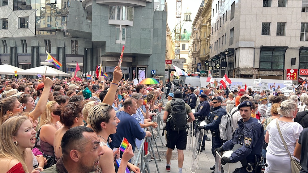 Zeitgleich prallten in direkter Nähe am Stephansplatz zwei Welten aufeinander. Der "Marsch für die Familie" (bestehend aus konservativen bis fundamentalistischen Christen und Neuen Rechten) stand einer etwa zehnmal größeren Gegendemo gegenüber – Polizisten trennten die beiden Gruppen.