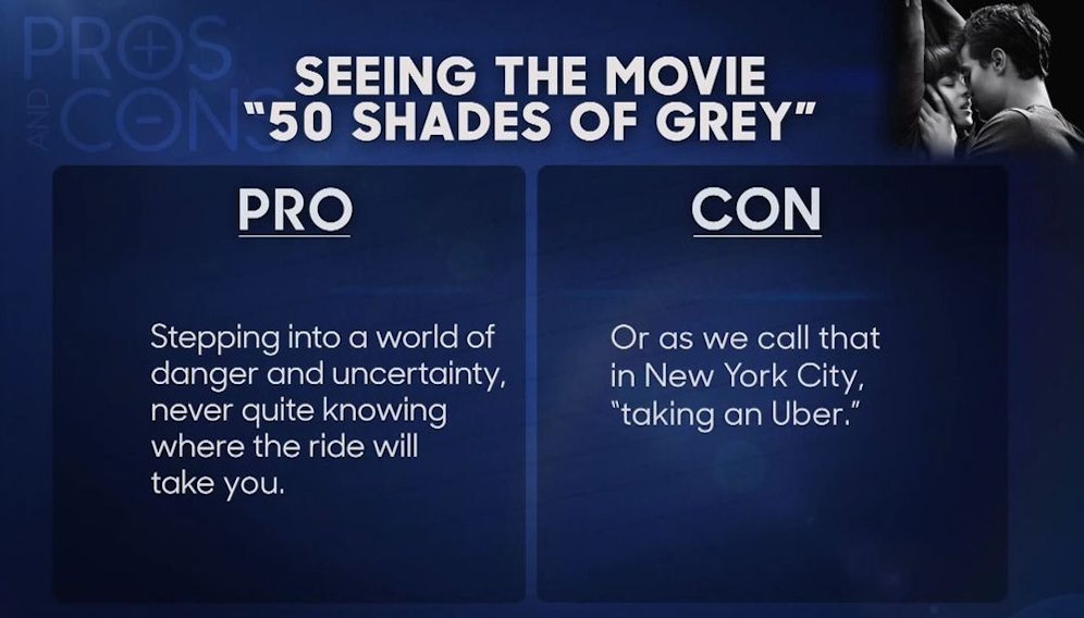 Was spricht dafür, sich "Fifty Shades of Grey" anzusehen, was dagegen? Diese Frage stellte sich Moderator Jimmy Fallon in der "Tonight Show" - indem er eine Liste von Pros und Contras erstellte. Während "Fifty Shades of Grey" in Österreich bereits im Kino läuft, startet der Film in den USA üerst am Valentinstag.