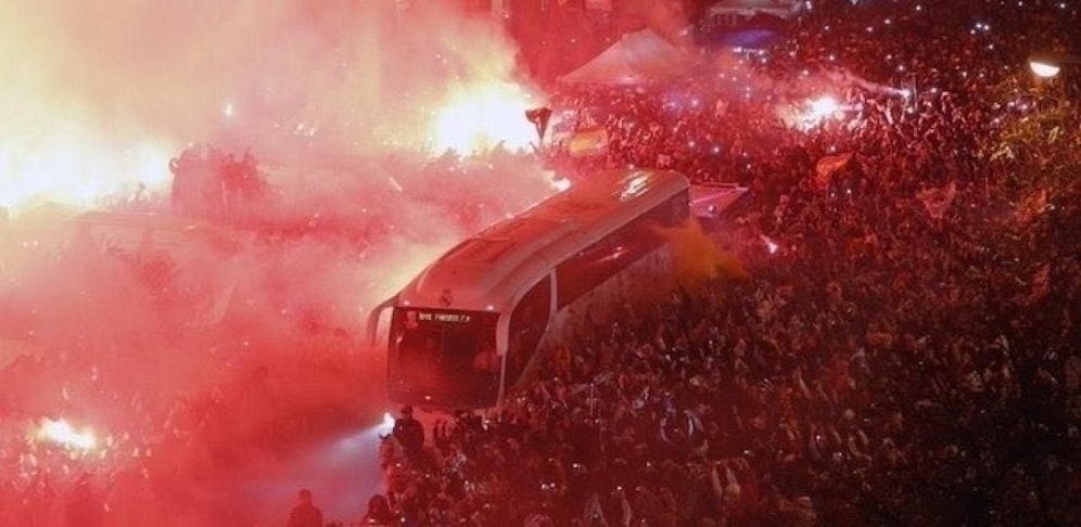 Dabei sorgten die Madrilenen für einen "Heißen Empfang" ihrer Mannschaft vor der Arena. Mit Pyro-Fackeln wurden die Straßen Madrids hell erleuchtet. Auch Böller krachten.