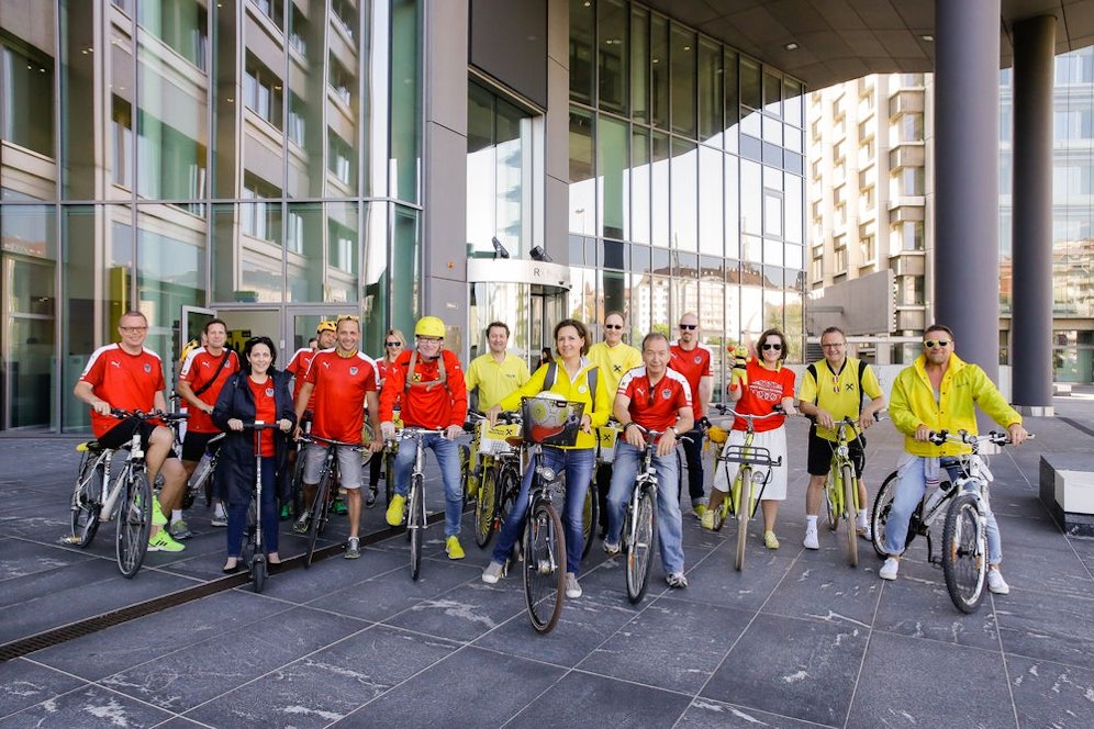 Das Top-Management von Raiffeisen in Wien radelte – ausgestattet mit ÖFB-Fanshirts – mit gutem Beispiel voraus: Georg Kraft-Kinz, Generaldirektor-Stellvertreter der RLB NÖ-Wien, besuchte gemeinsam mit Vertretern aus dem Management Firmenkunden in Wien. Von Casinos Austria über den Zweiradhändler-Familienbetrieb Jahelka in Meidling, die neu eröffnete Pratersauna bis zum Donaukanal war der Bogen der Radtour gespannt. Insgesamt wurden rund 35 Kilometer mit dem Rad zurückgelegt.
