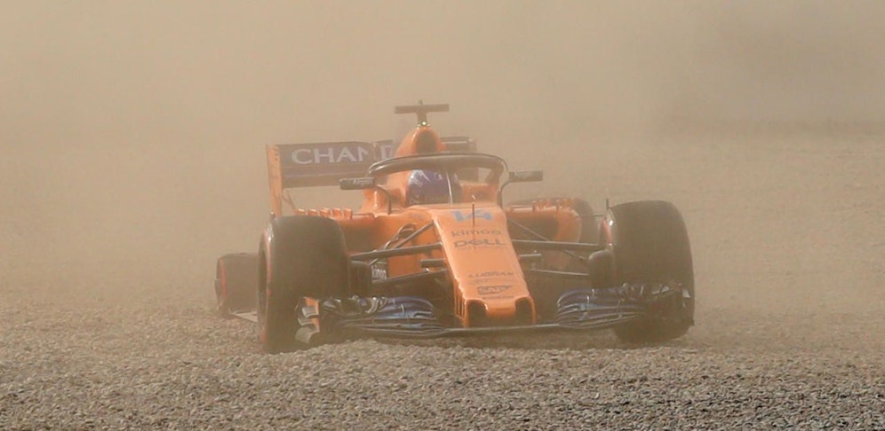 Bibber-Tests der Formel 1 in Barcelona bei eisigen fünf Grad. Gerade einmal 34 Minuten dauerte es bis zum ersten Abflug der neuen Saison. Und es erwischte ausgerechnet Ex-Weltmeister Fernando Alonso in seinem McLaren.