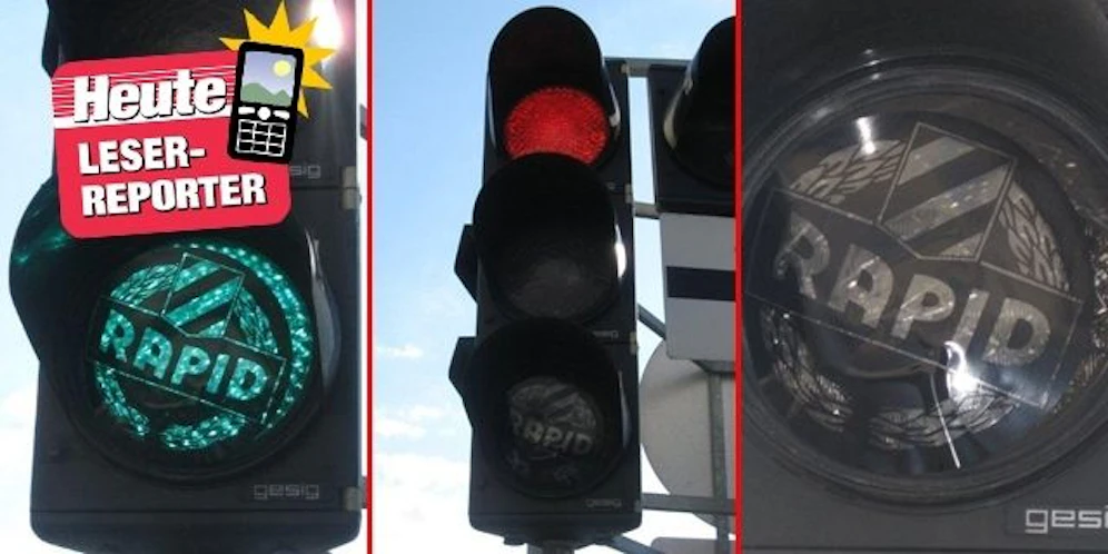 Dort leuchtet seit neuestem die "Rapid-Ampel". Fans des Rekordmeisters haben transparente Pickerl mit dem Rapid-Logo auf das grüne Licht der Ampeln geklebt, erstrahlt es, heißt für Autofahrer "freie Fahrt".