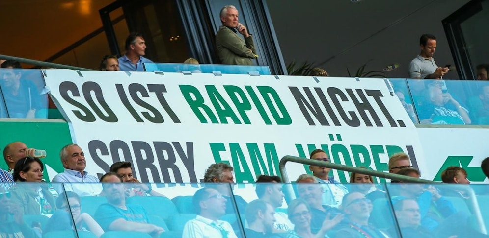 Das war wohl vielen Rapid-Fans doch zu viel. Beim Liga-Heimspiel gegen Hartberg (3:3) war ein Transparent im VIP-Klub zu sehen mit der Aufschrift: "So ist Rapid nicht. Sorry Familie Wöber". Doch lange blieb das Transparent nicht hängen. Warum wurde es entfernt? Laut laola1 marschierten Vertreter der Ultras in den VIP-Klub und entfernten das Banner.