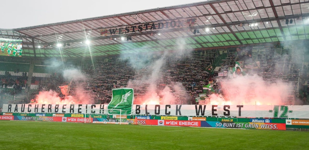 Kurz vor dem Anpfiff heizten die Hütteldorfer bei bitterkalten Temperaturen noch mit Bengalen ein – wie oben auf dem Bild zu sehen.